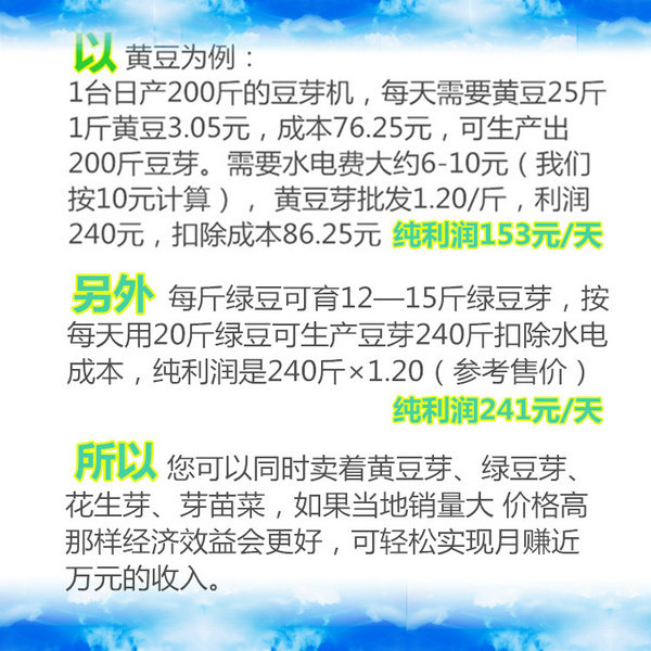 5、豆芽機產品特點: 1)我公司生產的全自動綠色無污染豆芽機,是現代技術與傳統工藝的結合。豆芽機通過微電腦自動控溫、自動加溫、自動顯示溫度、自動淋水,實現了生產過程的全自動化,具有省時、省工、低耗、無噪音等特點。 2)用我公司豆芽機生產的豆芽比傳統手工生產周期短質量好,一般手工生產豆芽的周期,夏季需4-5天,冬季需要7-8天,而豆芽機生產豆芽只要3-4天即可,且不受地理環境、氣候條件和季節的影響。 3)我公司豆芽機生產的豆芽不僅種類多,而且產量高,一斤豆種可生產10斤左右的豆芽。且人工控制的環境下,豆芽生長均勻一致,潔白鮮嫩、清脆多汁,口感清爽;不僅食用安全、營養豐富,還具有一定的食療保健作用。 4)節省勞力,操作方便。將浸泡后的豆種放進豆芽機育芽箱內,就不用管了,它會自動加溫,自動淋水,經過3-4天時間就可生產出潔白脆嫩的豆芽。